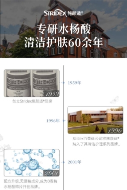1959年当大多数护肤品还停留在基础清洁层面时,stridex施颜适便开启了对水杨酸护肤领域的深耕。在那个护肤理念相对匮乏的年代,品牌便前瞻性地意识到水杨酸在解决油脂、痘痘等肌肤问题上的潜力。2001年更是剔除产品中可能引起刺激的酒精成分,为产品的发展跨越了一大步,2004年还被美国国家历史博物馆收藏,该品牌不仅在美国本土站稳脚跟,更逐步走向全球,成为无数人应对肌肤困扰时的信赖之选。