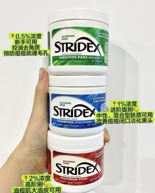 提到 Stridex 施颜适,就不得不提其标志性的水杨酸棉片,这款产品堪称品牌的经典,也是消费者认识并爱上它的起点。品牌深知不同肤质对水杨酸的耐受度存在差异,因此精心打造了0.5/1%/2%三款浓度的产品系列,实现了“量肤定制”的精准护肤。
